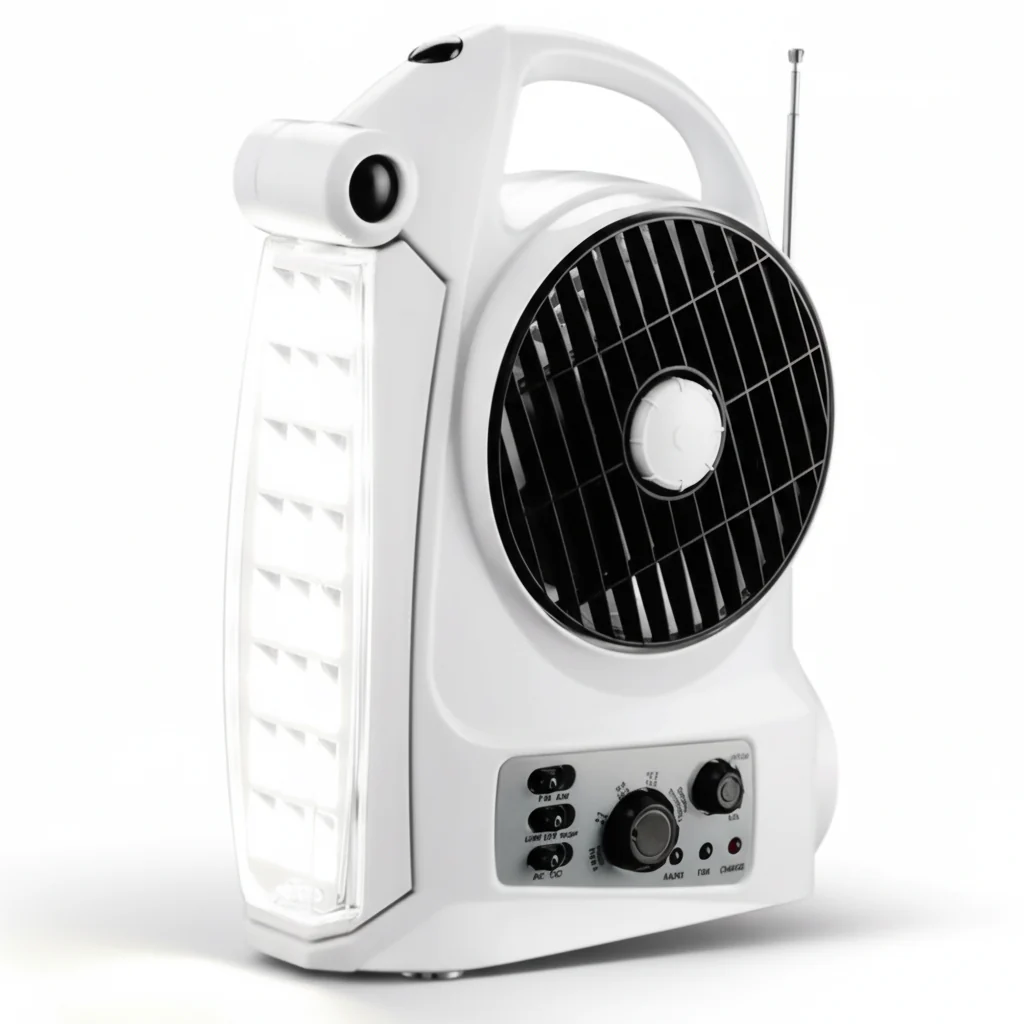 Portable 5" Rechargeable Fan with AM/FM Radio and Emergency Light.